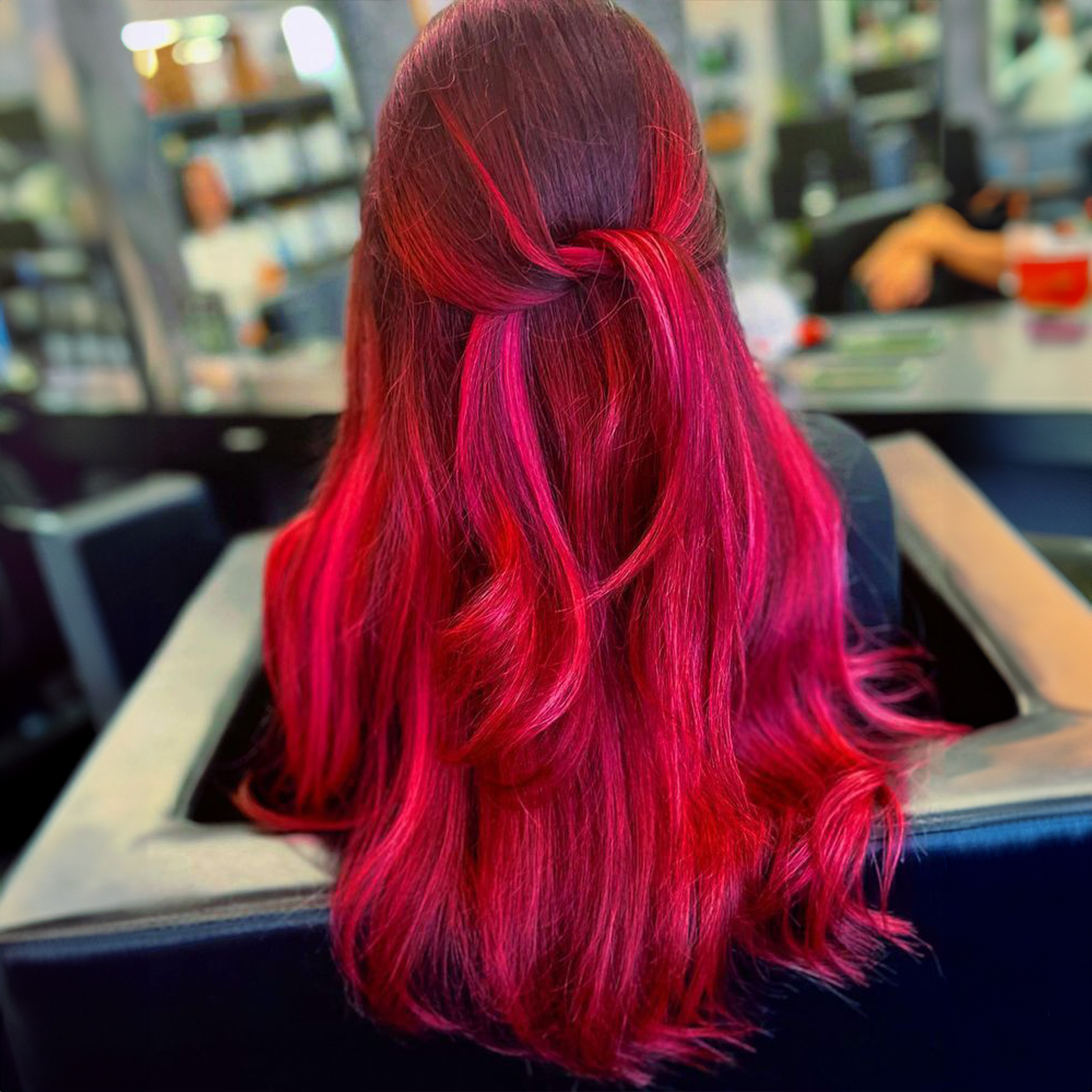 Hellfire Red ist ein Rotton, der sich ins Pinke auswäscht. Die Haare müssen nicht so hell blondiert werden, wie für andere Farben. Das Ergebnis wird allerdings weniger leuchtend, je dunkler die Haare sind.