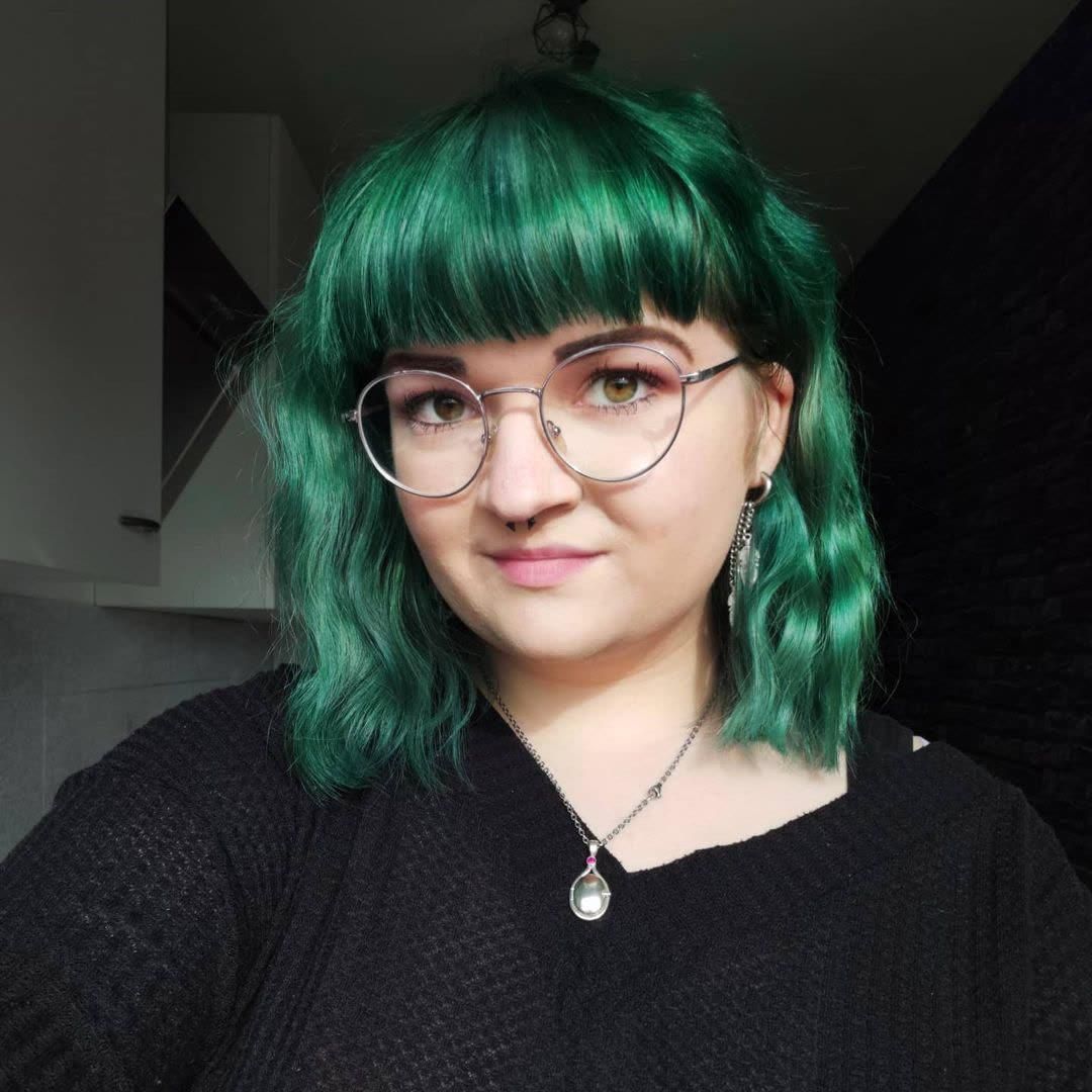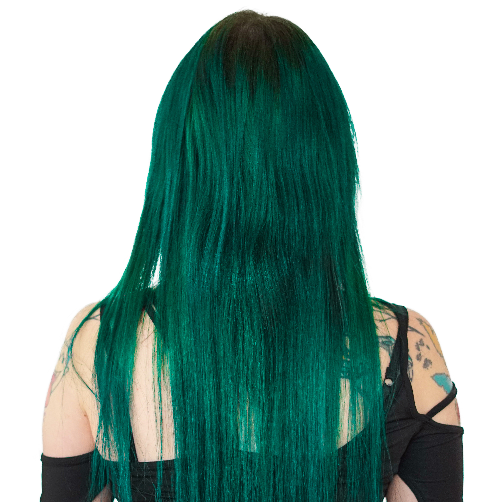 Toxic Absinth ist ein sehr dunkles, blaustichiges Grün. Für diese Farbe müssen die Haare nicht so hell gebleicht werden, wie für andere Farben. Der Blaustich kommt auf besonders hell blondierten Haaren am besten zur Geltung. Diese Farbe eignet sich auch für dunklere oder ungebleichte Haare, wird dann aber sehr viel gedämpfter und weniger leuchtend. Auf dunklen Haaren erzeugt sie nur einen grünen Schimmer.