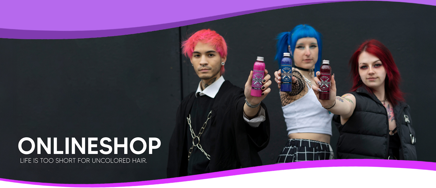 Im Gegensatz zu unseren knalligen, bunten Farben sollten die Haare für ein gutes Ergebnis mit "Headshot Blackout" auf keinen Fall vorher blondiert werden! Je dunkler deine Haarfarbe ist, desto besser. Mit 150 ml Inhalt ist in den Headshot Flaschen deutlich mehr Farbe enthalten als bei anderen Marken. Die Farbe ist vegan, tierversuchsfrei und wird in Europa hergestellt. Für ein optimales Farbergebnis empfehlen wir folgende Vorgehensweise: Feuchte die Haare an und lasse sie ca. 10 Minuten im Handtuch trocknen. Schütze die umliegende Haut mit Babyöl, Vaseline oder Creme. Achtung: Tönung kann Haut und Textilien verfärben. Die Haare Strähne für Strähne satt bestreichen. Benutze Einmalhandschuhe und einen Haarfärbepinsel, beides gibt es in der Drogerie. 30 Minuten oder länger einwirken lassen. Wärme verbessert das Ergebnis. Benutze vor dem Färben keine Pflegeprodukte wie z.B. silikonhaltige Shampoos, sonst wird möglicherweise die Farbe schlechter angenommen. Du kannst die Farben einer Marke auch mischen. Haartönungen sind nicht für Augenbrauen oder Wimpern gedacht, Augenkontakt unbedingt vermeiden! Die Tönungen waschen sich nach und nach wieder aus. Verfärbungen auf Textilien auch nach dem Tönen möglich! Die Farbergebnisse können varieren. Wir empfehlen daher, an einer geeigneten Haarsträhne einen Test durchzuführen, bevor du die Farbe auf das gesamte Haar aufträgst.